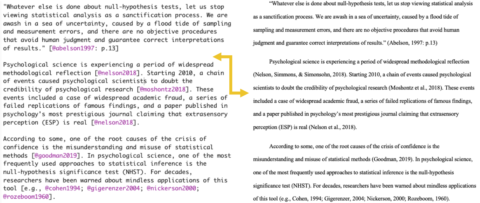 You can find a list of papers written with papaja here. Here’s a sneak peek of what’s happening behind the scenes, and the rendered result: